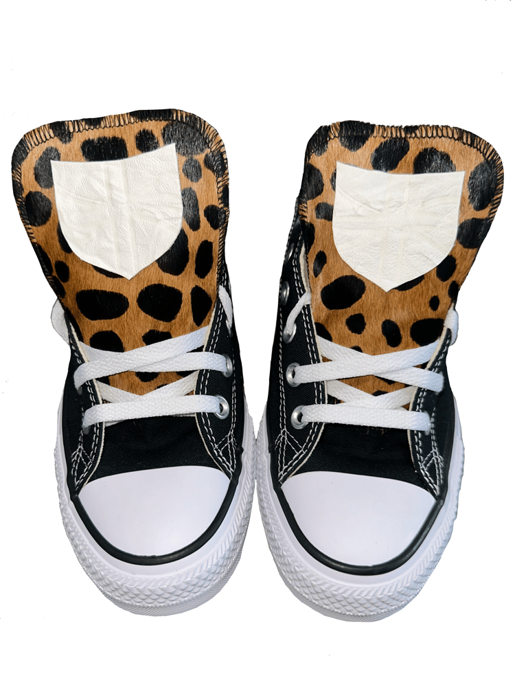WHITE LEATHER SHIELD CHEETAH CHUCKS